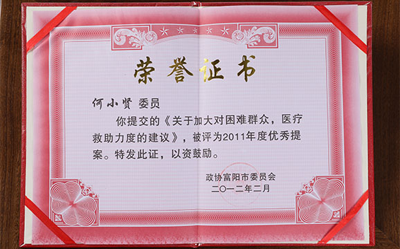 集團(tuán)董事長何小賢提交的《關(guān)于加大對困難群眾,醫(yī)療救助力度的建議》、《關(guān)于加強(qiáng)我市村鎮(zhèn)排污管網(wǎng)建設(shè)的建議》被評為2011年度政協(xié)優(yōu)秀提案。